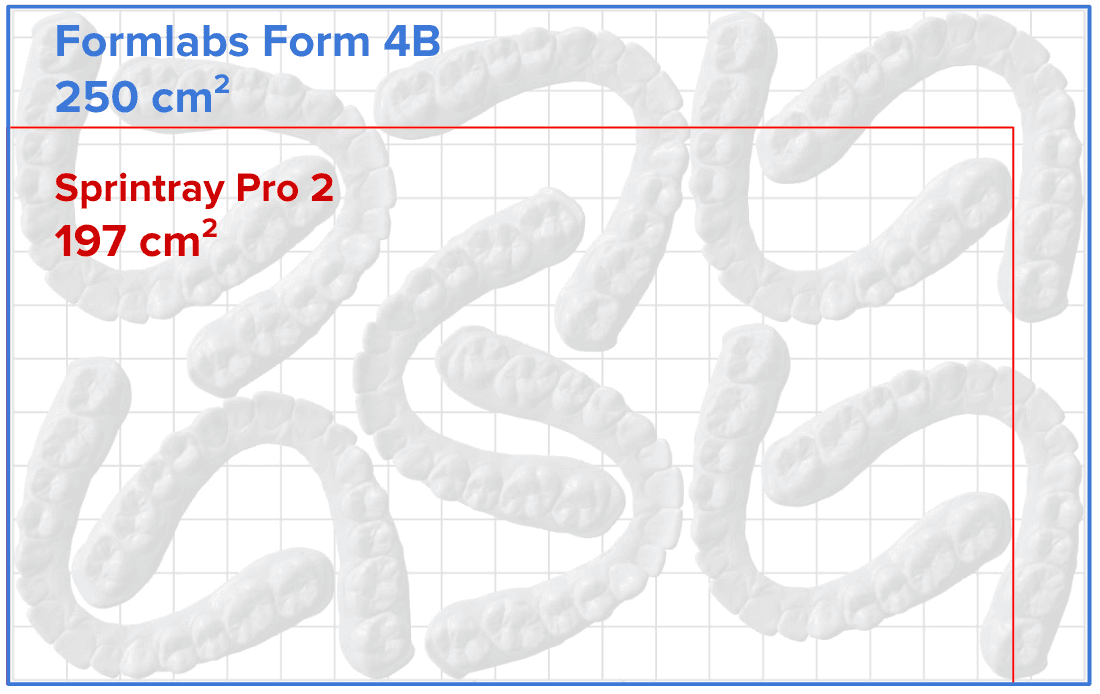 Das Fertigungsvolumen des SprintRay Pro 2 bietet mit 18,8 x 10,5 x 20 cm nur für 6 Vollbogenmodelle oder Schienen Platz, was einen niedrigeren Durchsatz und mehr manuelle Eingriffe am Drucker bedeutet.