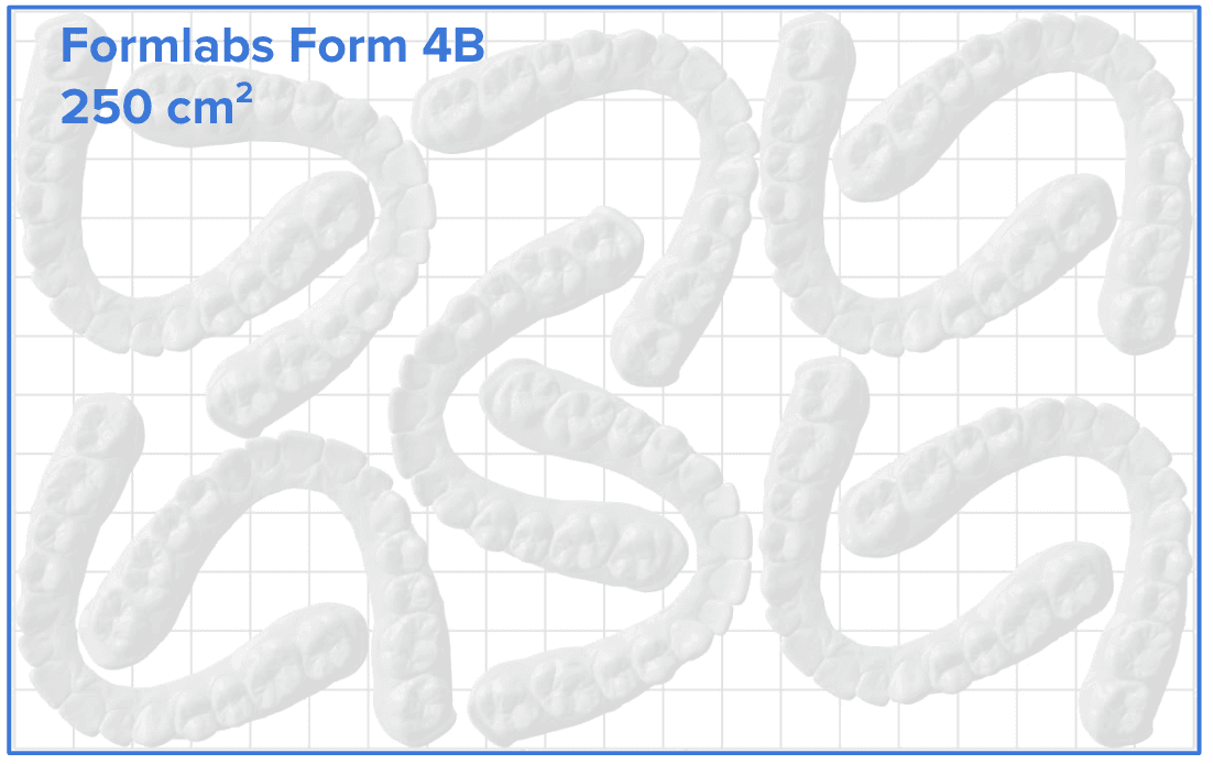 Drucken Sie bis zu 11 Modelle für transparente Aligner oder 8 Schienen in einem Druckauftrag, dank des 27 % größeren Fertigungsvolumens von 20 x 12,5 x 21 cm.