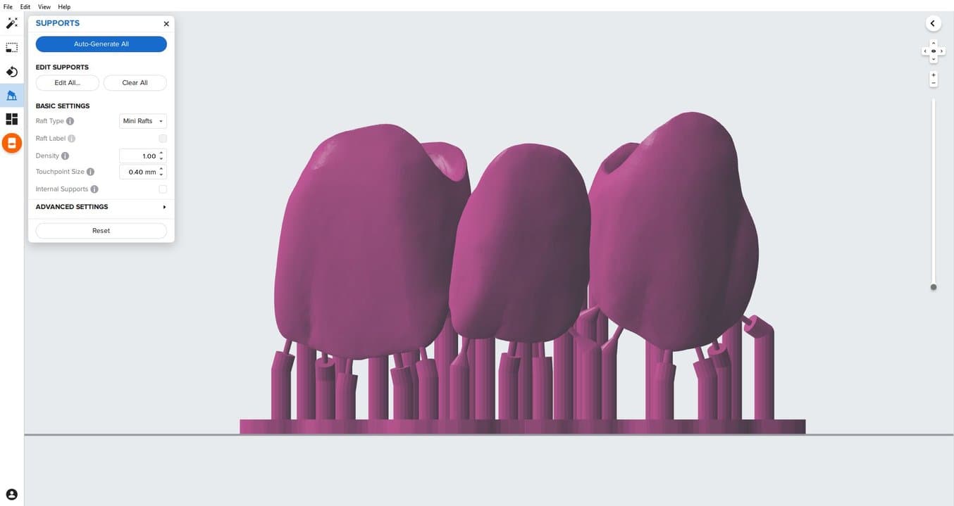 Verschiedene 3D-Drucke benötigen unterschiedliche Arten an Stützstrukturen. Bei größeren Modellen helfen Stützstrukturgerüste nicht nur bei der horizontalen Stabilisierung des Teils während des Druckvorgangs, sondern sie vereinfachen nach dem Drucken auch das Ablösen der Stützstrukturen in einem Stück. Bei leichten, kleinen Teilen wie Dentalvorrichtungen führen umfangreiche Gerüste jedoch dazu, dass Drucke sich verheddern oder komplizierte Verschachtelungen entstehen, die sich schwer ablösen lassen.