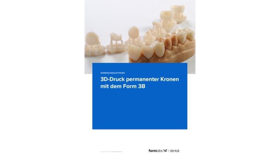 Dieser Anwendungsleitfaden zu Formlabs Permanent Crown Resin schildert Zahntechnikern und Zahnärzten den 3D-Druck monolithischer vollanatomischer Kronen und Dentalvorrichtungen für die permanente Verwendung. Beziehen Sie sich immer auf die offizielle Gebrauchsanweisung im Lieferumfang des Kunstharzes für Informationen über die absoluten Anforderungen.