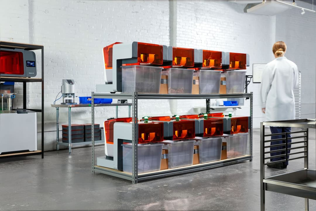 Le cabinet utilise 12 imprimantes, dont deux imprimantes Formlabs, pour créer des modèles servant au thermoformage de plaques occlusales, des plateaux de collage indirect, et même des brackets imprimés directement sur la plateforme de fabrication. En gardant sa production en interne, la Dre Alvetro est ainsi parvenue à réduire les coûts et à améliorer l'efficacité de son cabinet, mais son personnel devait encore consacrer beaucoup de temps à des tâches manuelles, comme par exemple retirer les plateformes de fabrication et les pièces ou gérer la file d'attente des tâches pour chaque imprimante individuelle.