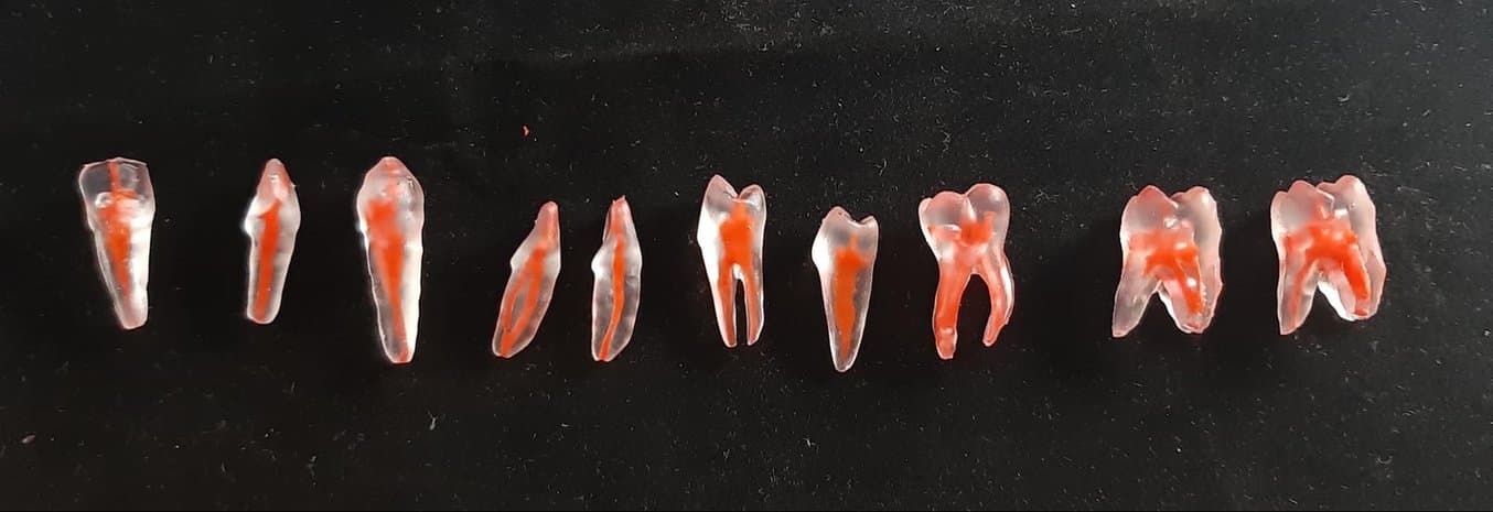 Quelques-uns des modèles de dents imprimés en 3D et peints à la main (racines simples et multiples) fabriqués par l'équipe de Btech.