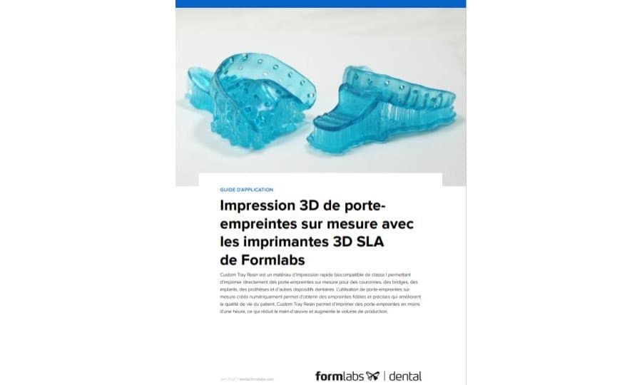 Ce guide d’application présente chaque étape de la réalisation de porte-empreintes imprimés en 3D sur des imprimantes 3D SLA Formlabs. Suivez la procédure de travail suivante pour garantir des résultats précis.