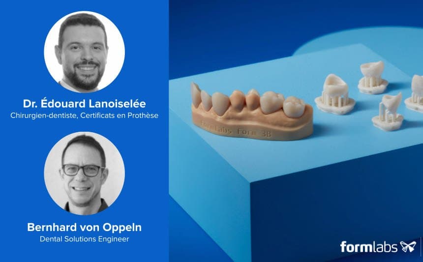 Rejoignez-nous pour ce webinaire en direct, accompagné du Dr Édouard Lanoiselée, Chirurgien-dentiste, Certificats en Prothèse et Bernhard von Oppeln, Master Dental Technician et Dental Solutions Engineer chez Formlabs pour parler de la résine pour couronnes permanentes de Formlabs qui permet de fabriquer des restaurations permanentes pour des unités individuelles.