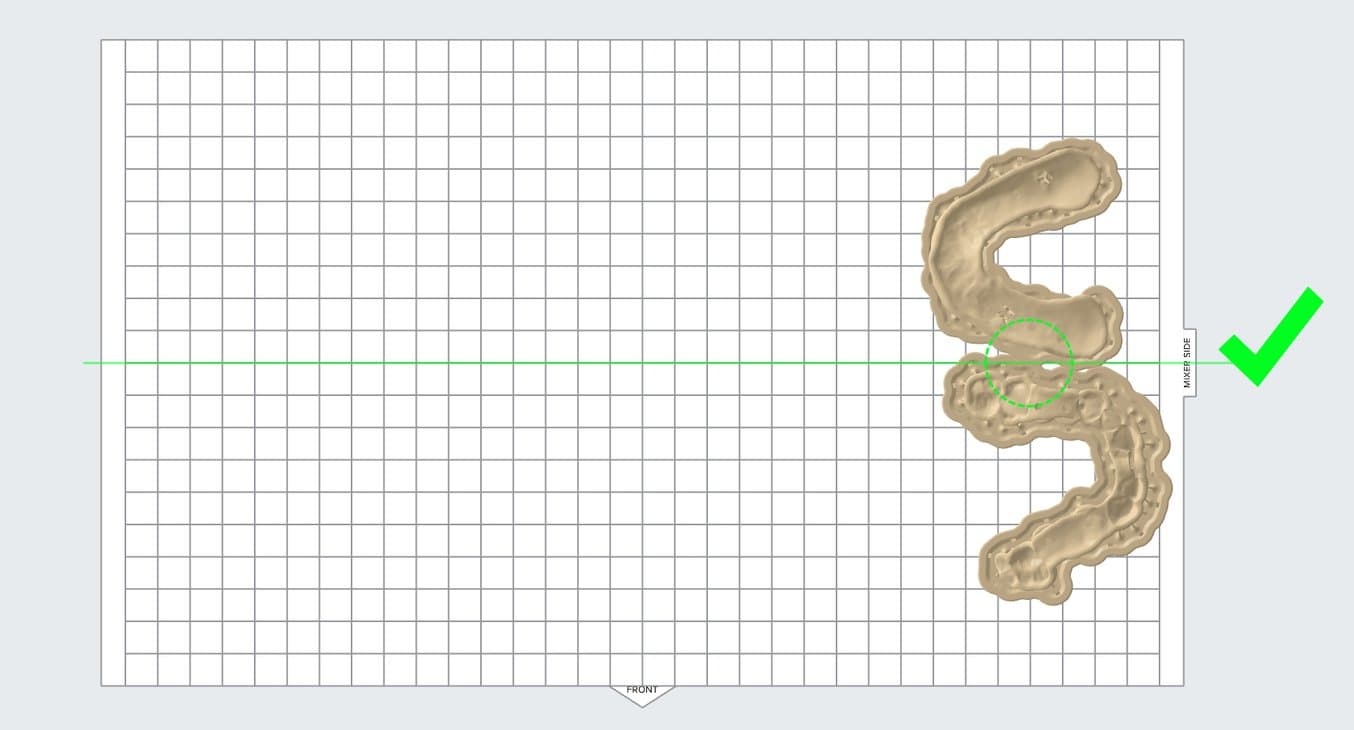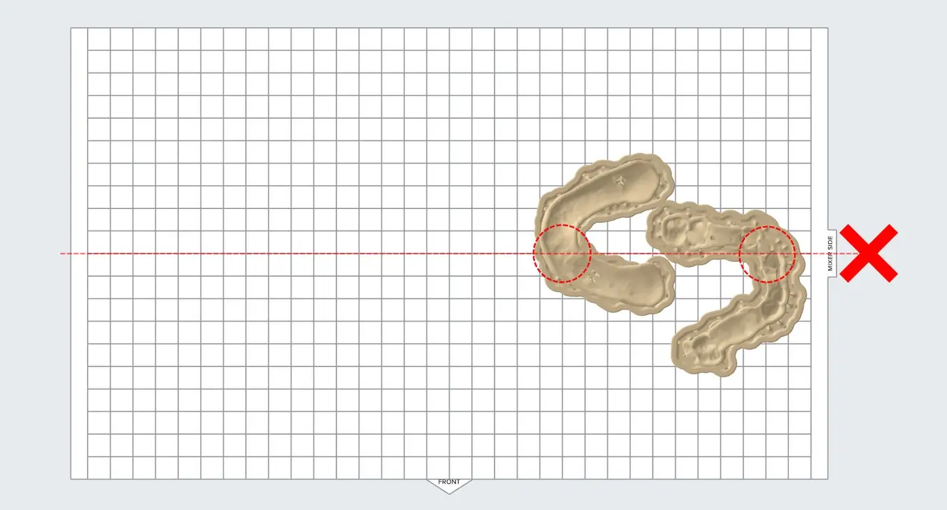 Orient parts horizontally with the intaglio surface facing away from the build platform to ensure that the supports will not be generated on these surfaces. If printing more than one surgical guide in a single print, manipulate the placement of each model on the build platform for the best fit.