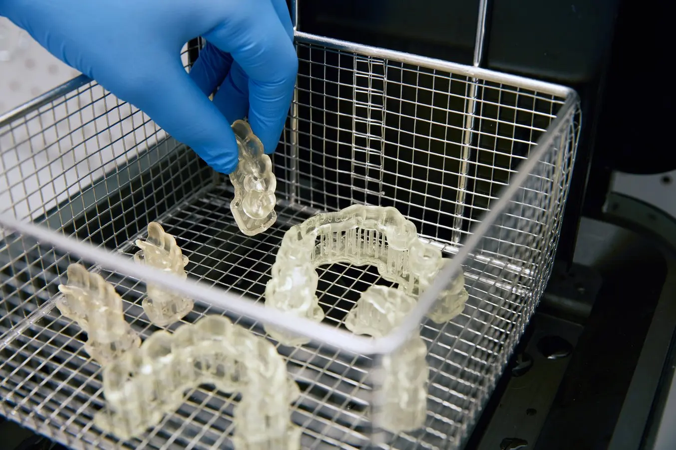 Place the surgical guides, free-standing or still attached to the build platform, in a Form Wash filled with 99% isopropyl alcohol (IPA). Set to wash for 20 minutes to clean the parts and remove liquid resin before post-curing.