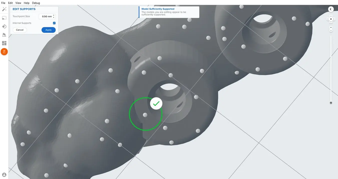 To allow for simple and precise assembly, ensure that there are no supports near the guide sleeve holes or on the intaglio surfaces. Use the manual support editing feature to closely inspect support locations and add or remove supports as needed.