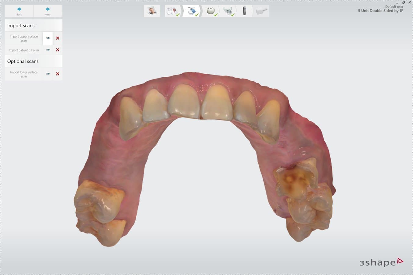 Import the intraoral or desktop 3D optical scans of the patient's dentition and the CBCT scan of the patient's hard tissue structures into your dental CAD software.