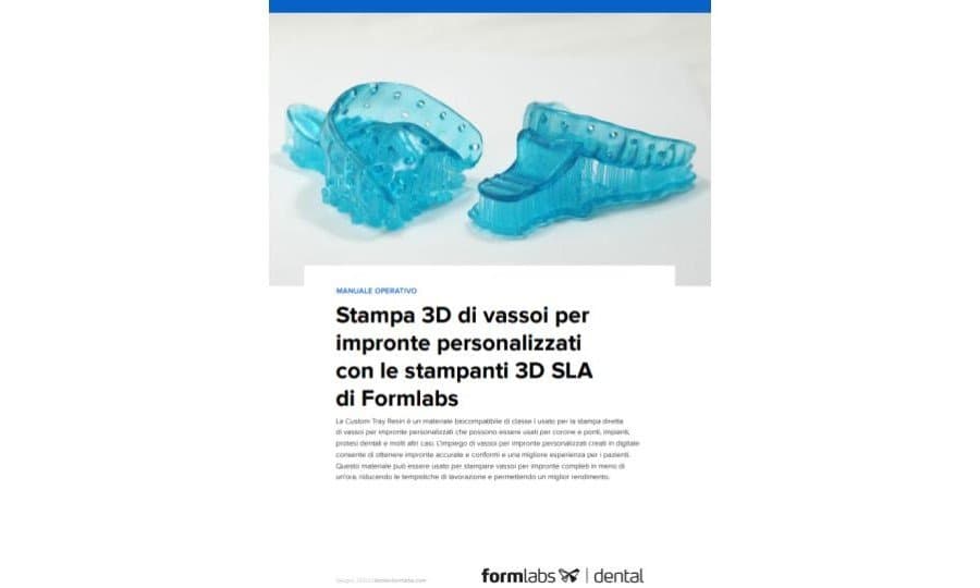 Questo manuale operativo illustra passo dopo passo come eseguire la stampa 3D di vassoi per impronte personalizzati con le stampanti 3D SLA di Formlabs. Segui il workflow descritto di seguito per ottenere risultati precisi.