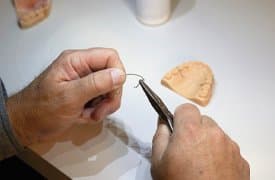 Usa le pinze apposite per piegare il filo, formare l'arco e sagomarlo alla dentatura del paziente. Una volta piegato il filo, usa la cera dentale per mantenerlo in posizione, in modo da poterlo fissare all'acrilico. I test eseguiti da Formlabs hanno mostrato che le parti metalliche dei modelli stampati sono analoghe a quelle dei modelli in gesso, benché le parti in cera possano essere più fragili.