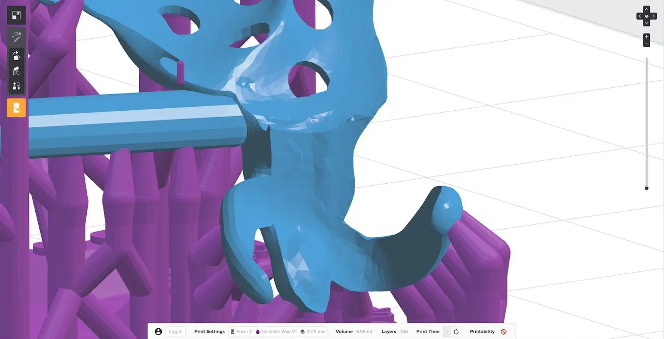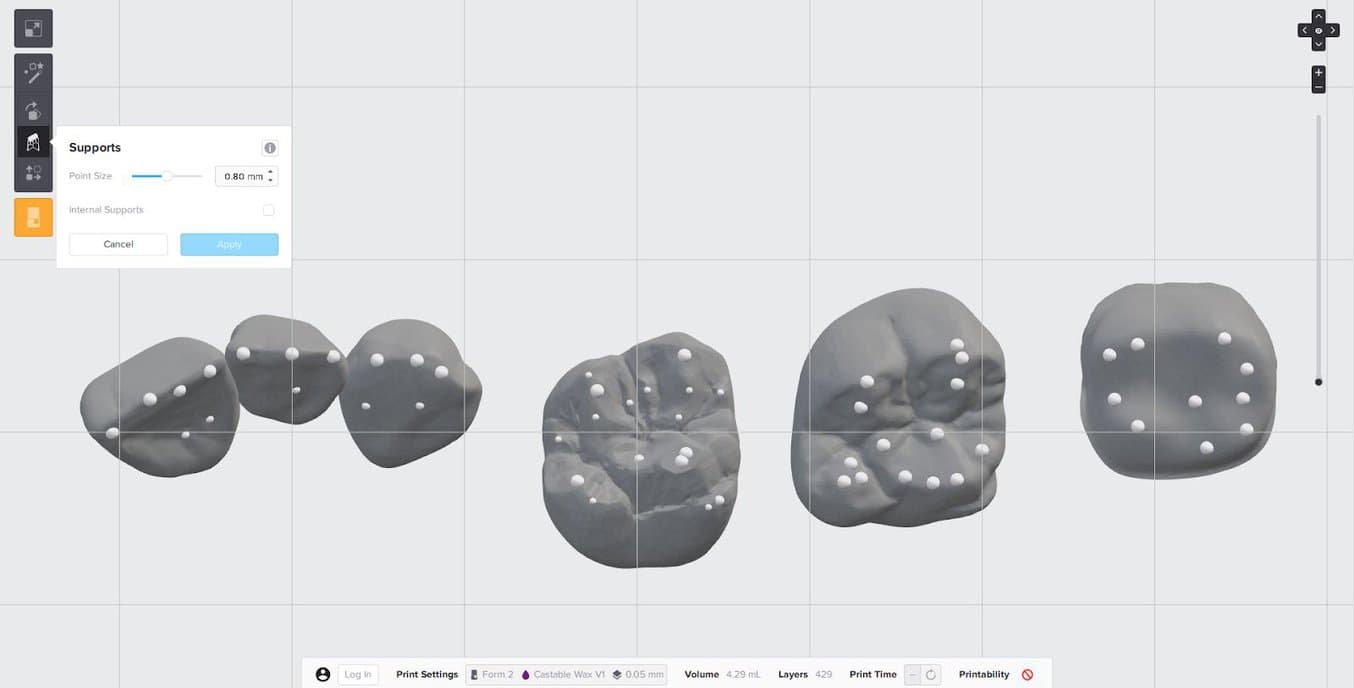 Nel menu “Print Setup” (Impostazione stampa) in PreForm, seleziona la stampante in base al suo nome di serie. Seleziona "Castable Wax " dal menu Material (Materiali). Stampa i modelli in cera con 0,05 mm di spessore per ridurre i tempi di stampa e ottenere un'accuratezza di livello clinico.
