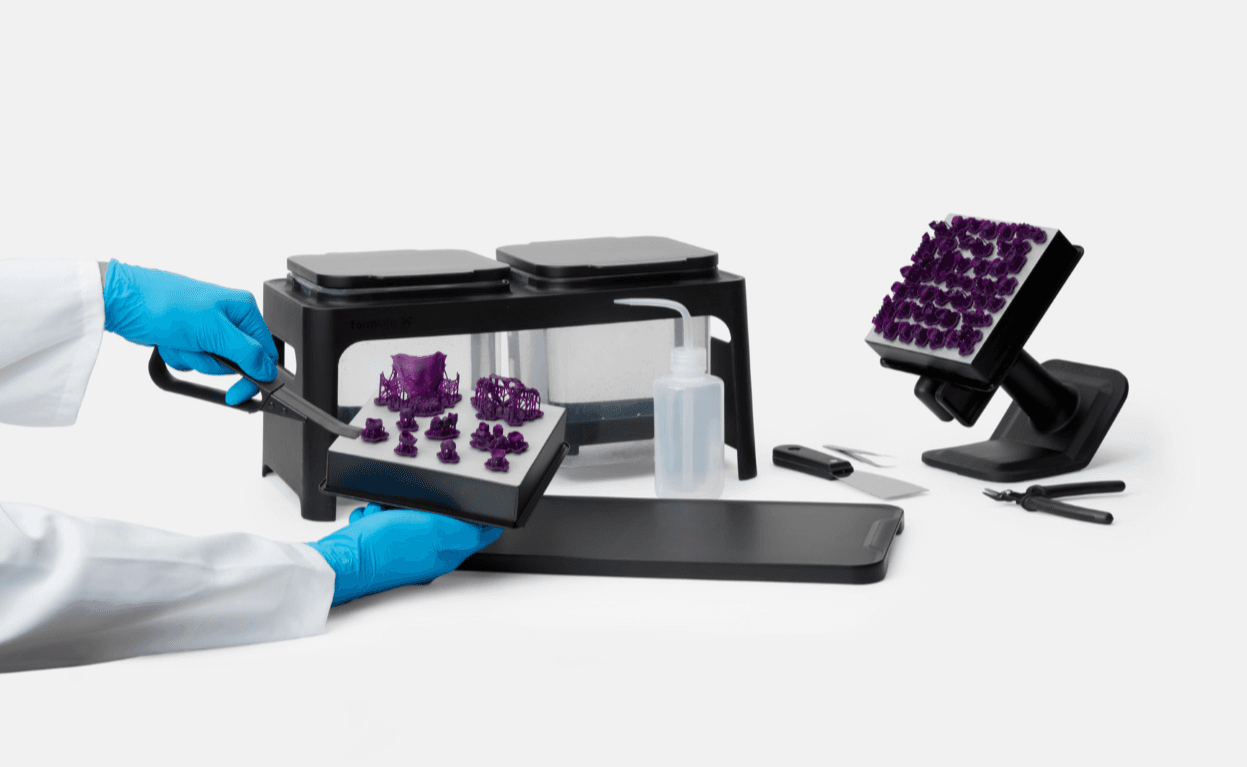 Se utilizzi un Finish Kit, rimuovi con cautela le parti dalla piattaforma di stampa una volta completata la stampa. Inserisci saldamente il raschietto incluso nella smussatura della base di supporto, quindi ruota delicatamente il raschietto da un lato all’altro. Sciacqua le parti in due cestelli di alcool isopropilico, con un bagno iniziale di 10 minuti e un secondo bagno di 5 minuti. È consigliabile utilizzare alcool isopropilico (IPA) con concentrazioni di 99% o più, ma concentrazioni di 90% o più funzioneranno comunque.