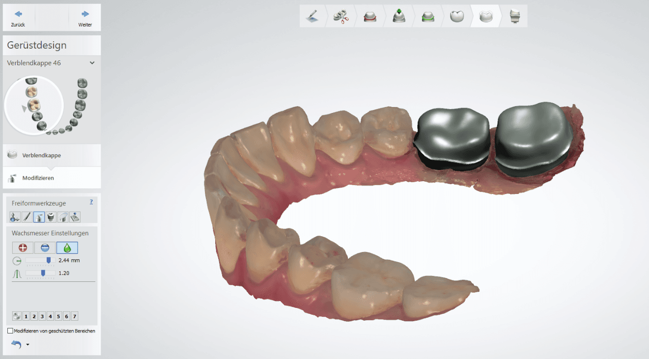 Progetta corone e ponti utilizzando le impostazioni dei materiali fornite da Formlabs (vedi “Impostazioni CAD materiale”).