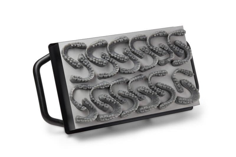 An example of a Form 3BL build platform. The Form 3BL can print up to 24 models or appliances per print in a horizontal layout and up to 52 models or appliances per print oriented vertically.